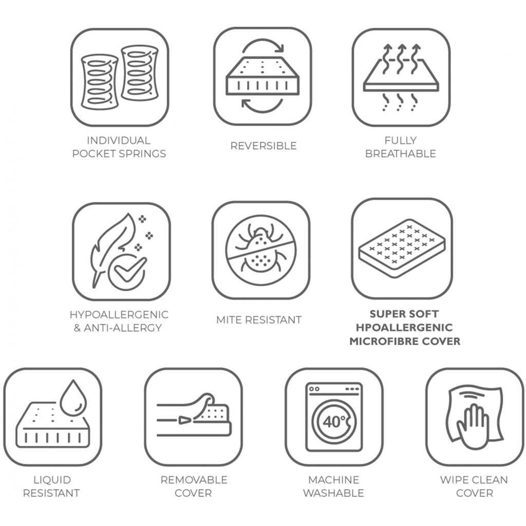 Its individually pocket-sprung core ensures maximum support and comfort, while the reversible design prolongs the mattress’s life. The classic quilted cover can be removed, it is machine washable up to 40 degrees and is fully breathable and air permeable.