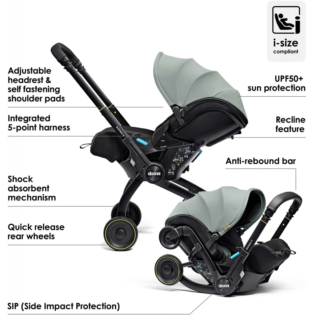 Doona X is the new generation of the Doona Car Seat & Stroller. Now with 3 recline positions, Doona X allows your child to lie down and relax. With its integrated, adjustable harness and headrest, the Doona X meets the European i-Size safety regulation (R-129). The patented shock absorbers and smooth-release system offer a smoother and safer ride than ever. The Doona X comes with the Doona SIP add-on, providing enhanced side-impact protection.