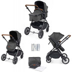 Ickle Bubba Cosmo 6 Piece Pram Graphite Grey is an affordable solution for any parent. The stylish pushchair has flair, sophistication and luxury fabrics that place as little stress on your bank balance as possible. Baby can sleep comfortably in a fleece-lined footmuff while the apron with privacy panel protect from the weather and outside disturbances as they rest.
