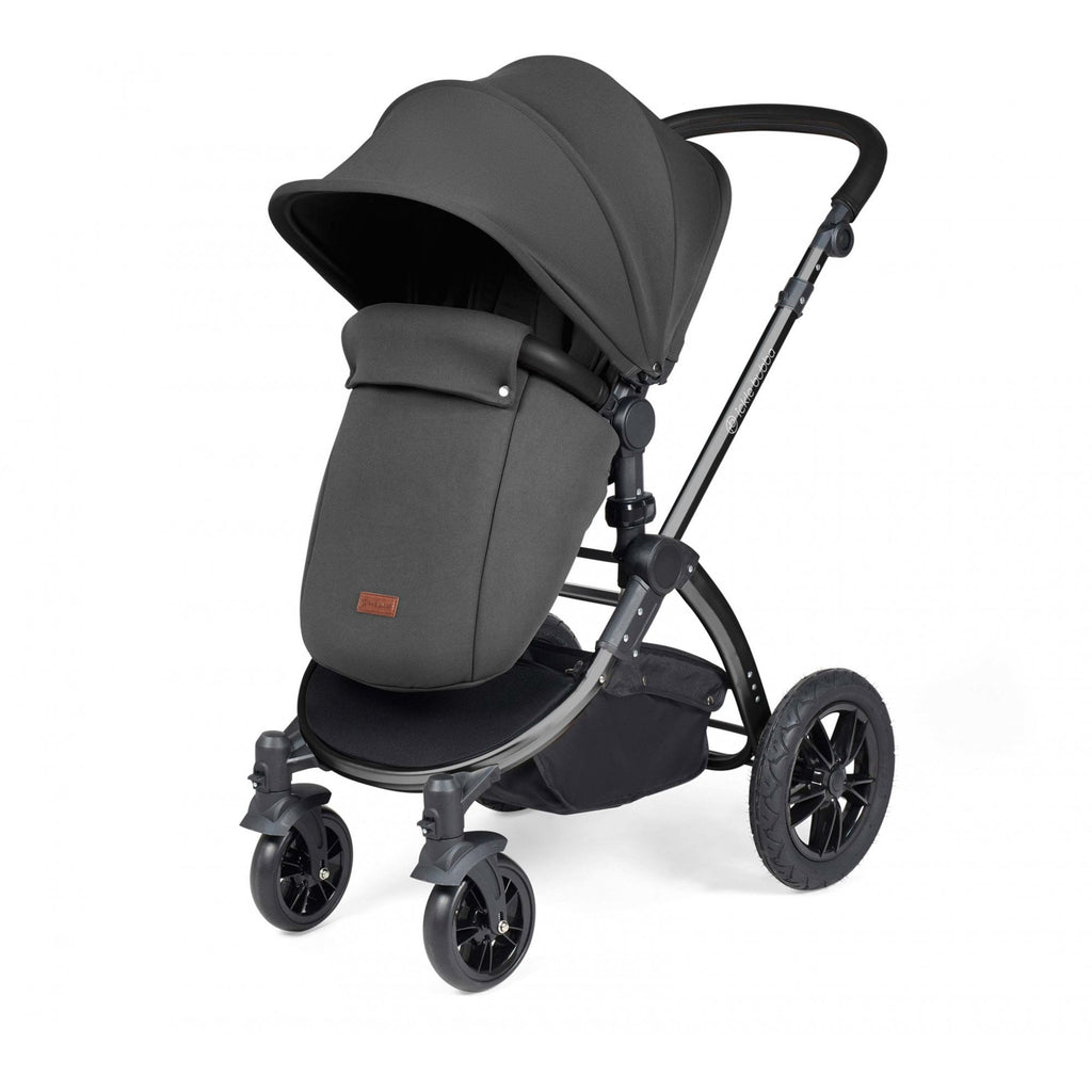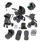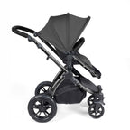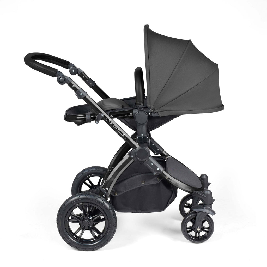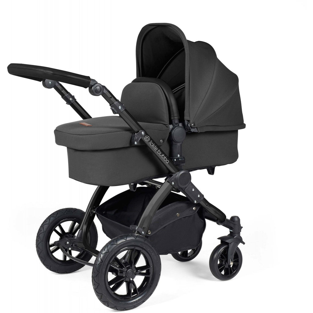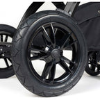 Ickle Bubba Stomp Luxe 12 Piece Travel System with i-Size Stratus Car Seat & ISOFIX Base Charcoal is a little slice of luxury with all-terrain capability. Large puncture-proof rear wheels with thick tread and front locking swivel wheels give you control to suit the type ground you're travelling on. The rear wheels can be removed using the quick-release for easy cleaning and storing.