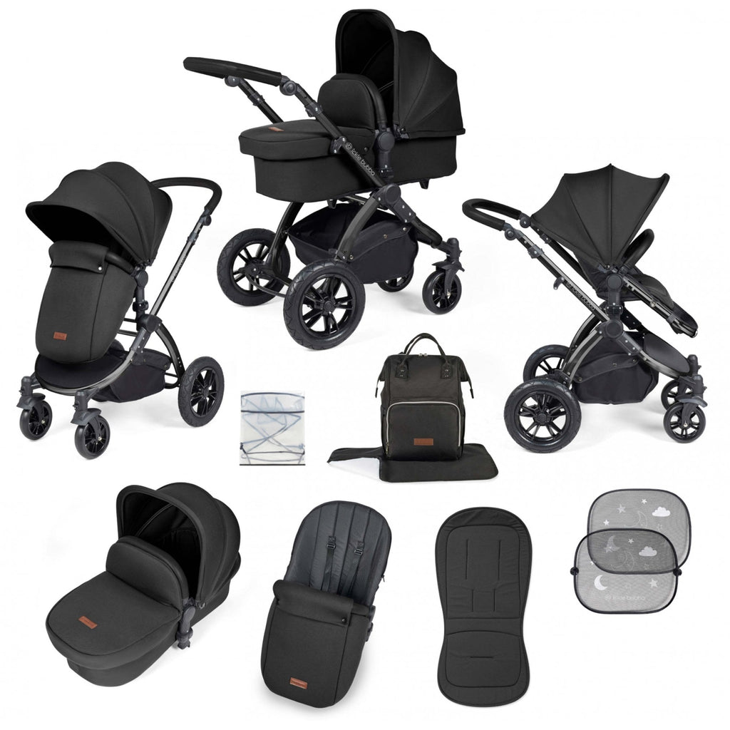 Ickle Bubba Stomp Luxe 9 Piece Pram Midnight is a little slice of luxury with all-terrain capability. Large puncture-proof rear wheels with thick tread and front locking swivel wheels give you control to suit the type ground you're travelling on. The rear wheels can be removed using the quick-release for easy cleaning and storing.
