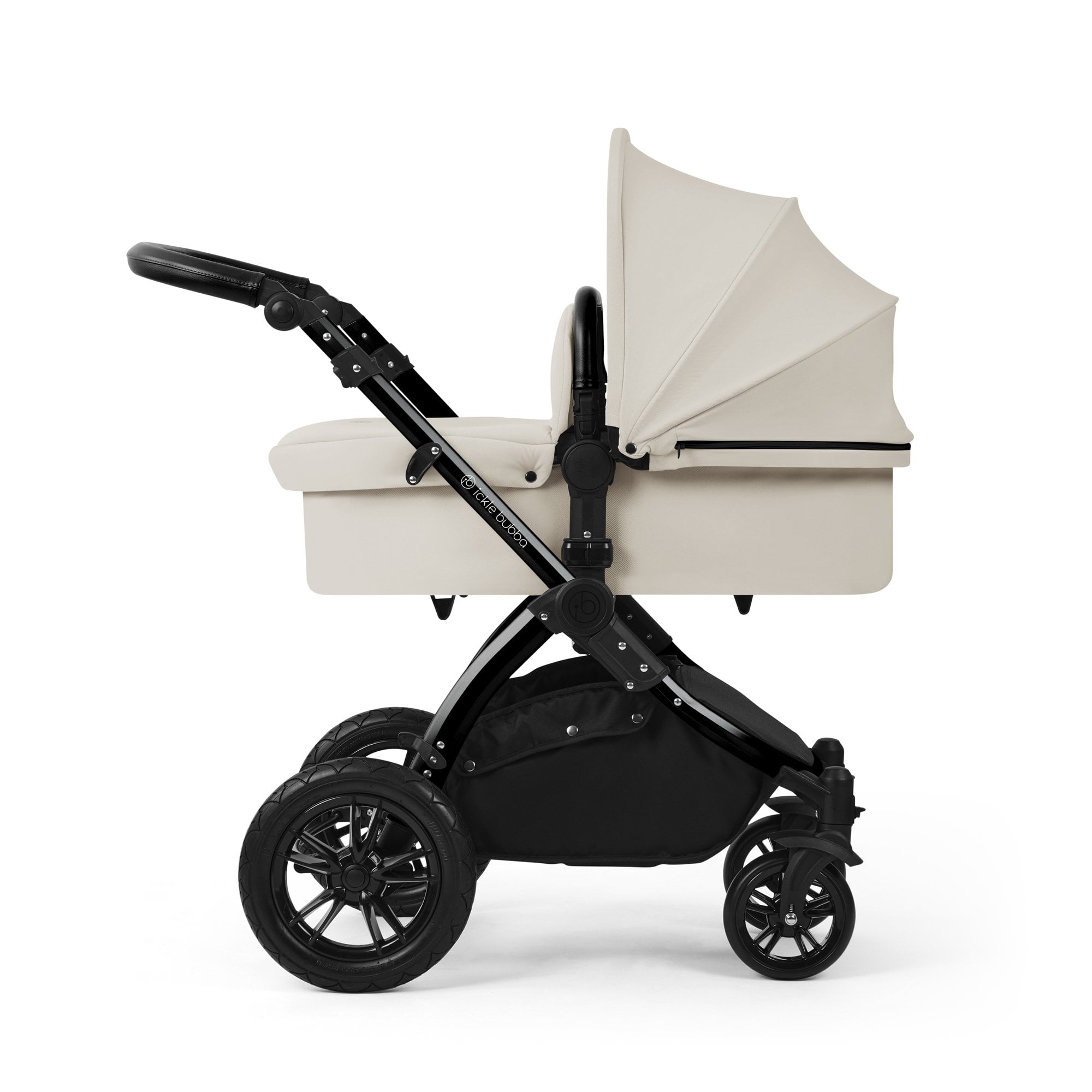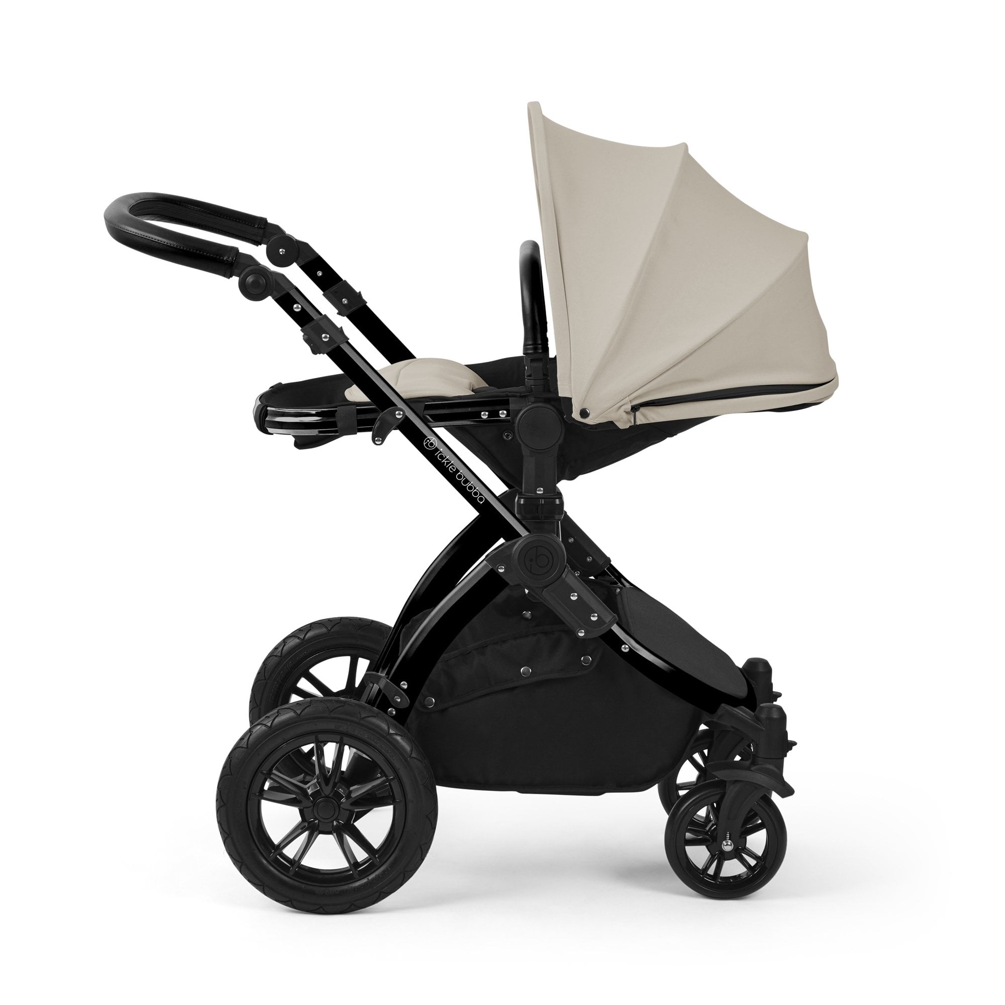 Ickle Bubba Stomp Luxe 9 Piece Pram Midnight is a little slice of luxury with all-terrain capability. Large puncture-proof rear wheels with thick tread and front locking swivel wheels give you control to suit the type ground you're travelling on. The rear wheels can be removed using the quick-release for easy cleaning and storing.