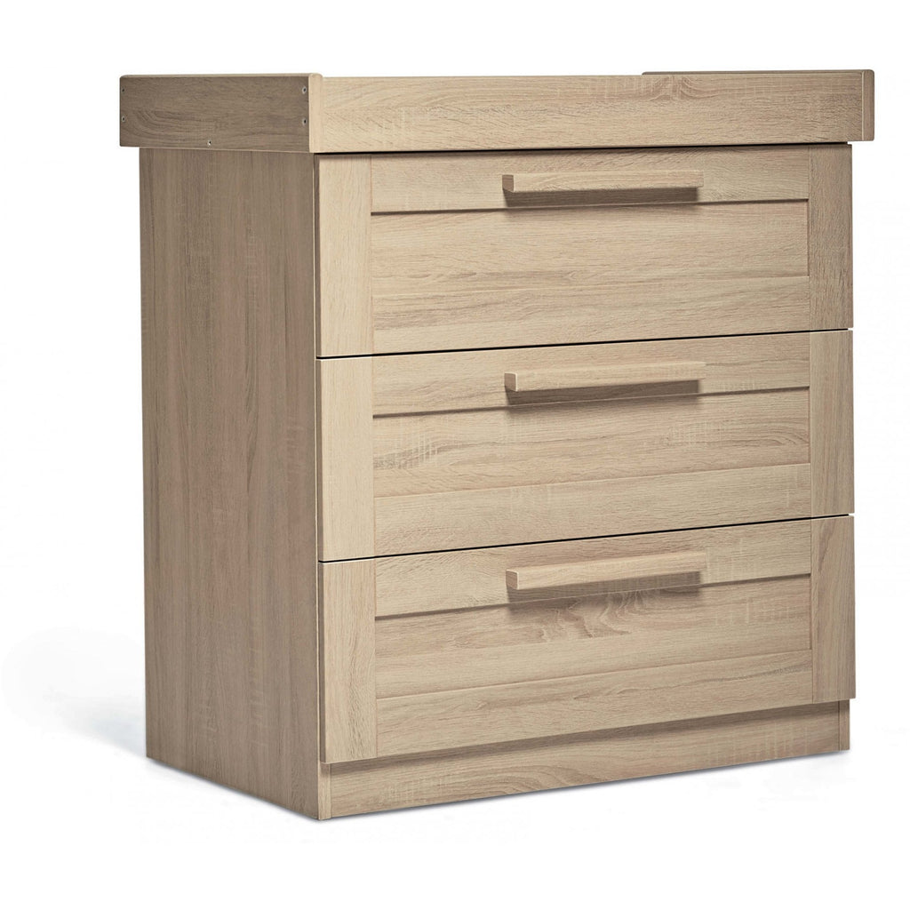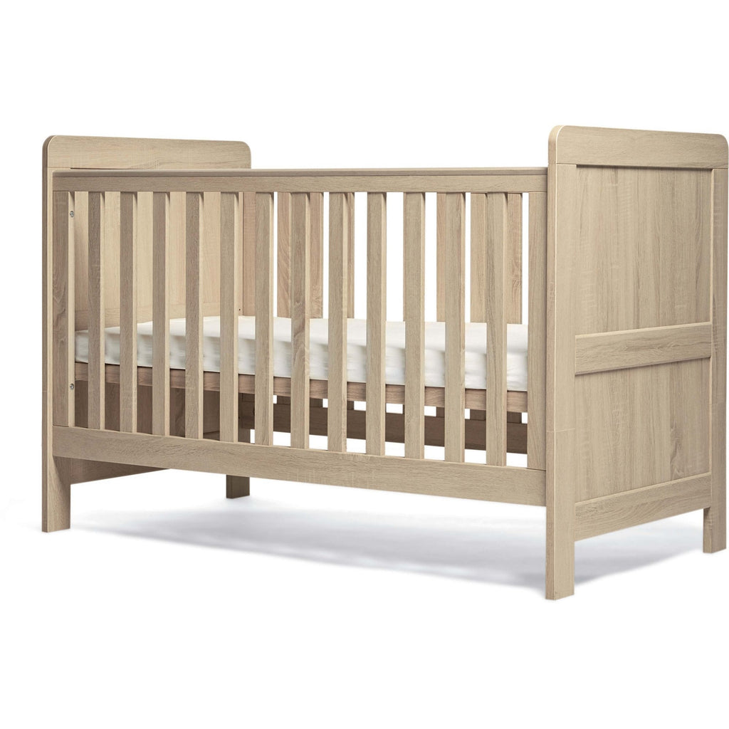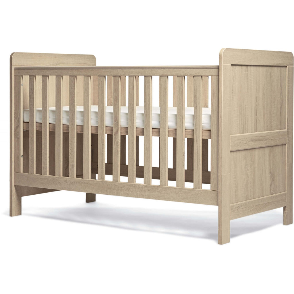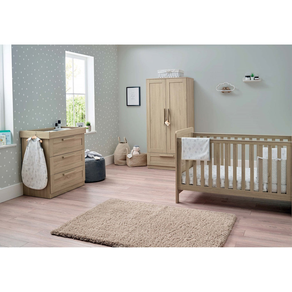 Atlas 3 Piece Nursery Set from Mamas & Papas has a classic look with a traditional woodgrain finish. Consisting of a two door wardrobe with two removable hanging rails and a large base drawer for plenty of storage, a dresser changer with three large drawers and a removable changer top and a cot bed with three height position base that will also convert to a toddler bed. A separate mattress of size 140 x 70 x 10 cm will be required for the cot bed.