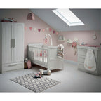 Atlas 3 Piece Nursery Set from Mamas & Papas has a classic look with a traditional woodgrain finish. Consisting of a two door wardrobe with two removable hanging rails and a large base drawer for plenty of storage, a dresser changer with three large drawers and a removable changer top and a cot bed with three height position base that will also convert to a toddler bed. A separate mattress of size 140 x 70 x 10 cm will be required for the cot bed.