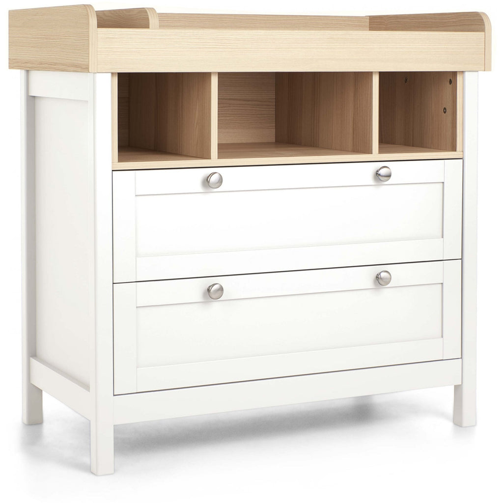 The Harwell White/Natural 3 Piece Nursery Furniture Set consists of a cot bed, dresser/changer and Wardrobe. With a lovely, calming two-tone neutral colour palette the Harwell White/Natural has a combination of a clean white and warm natural wood colours. A very modern set with eye-catching appeal.