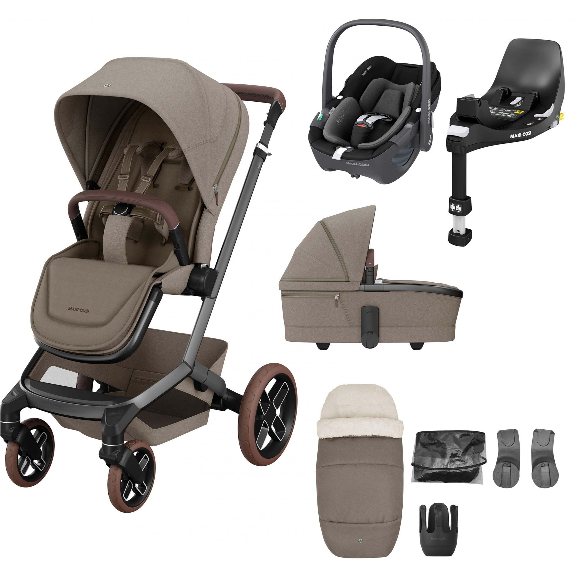 Maxi Cosi Fame 8 Piece Complete Bundle Twillic Truffle With Brown Wheels