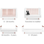When baby is old enough to leave the cot bed (around 18 months) it can be converted into a transitional toddler bed to get them used to not having the cot sides (only one remains in place) while still maintaining some familiarity. Eventually both sides are removed and the bed is suitable up to 4 years old.