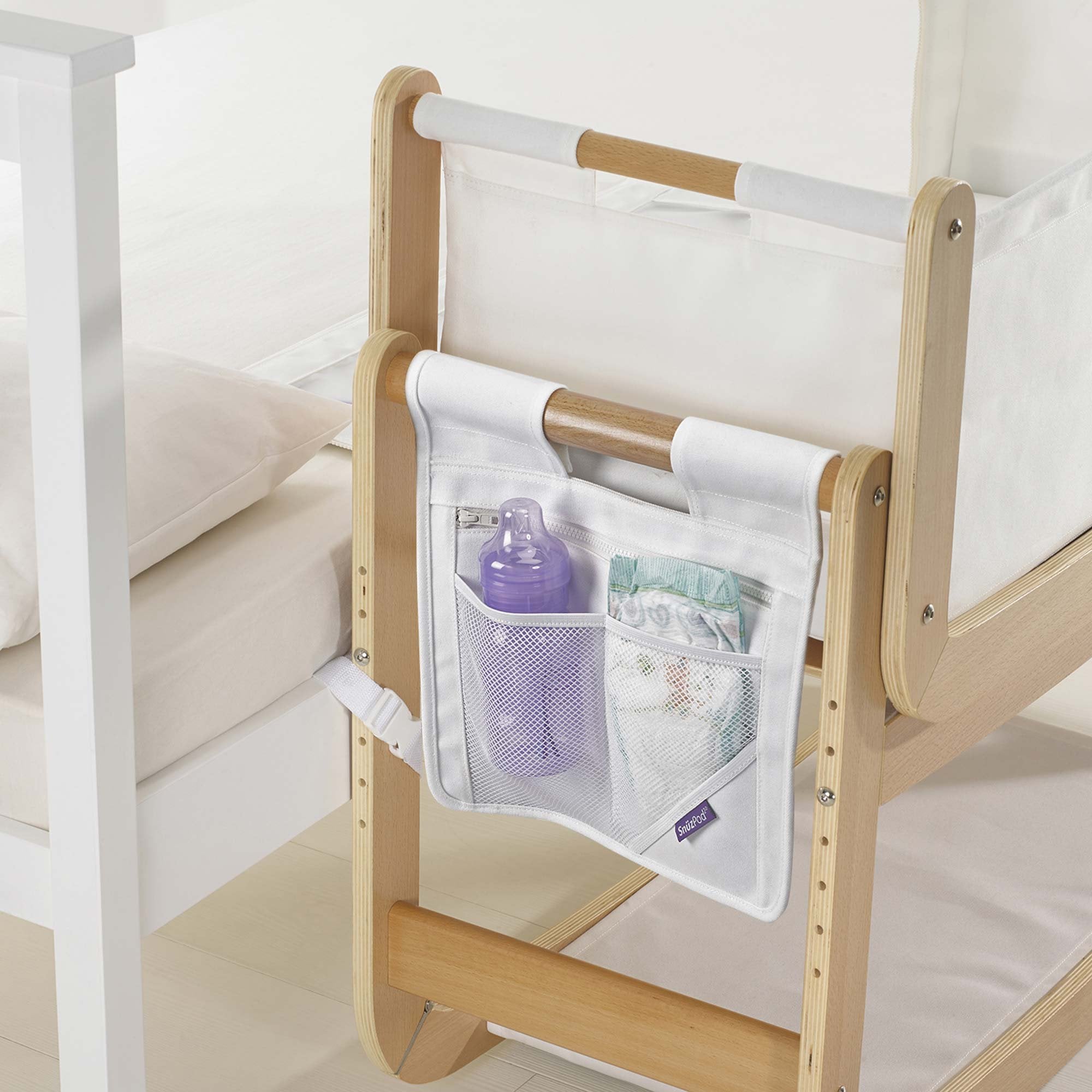 A handy. durable storage pocket designed to perfectly match your Snuzpod crib. Made from canvas, the pocket is a sturdy and clever storage solution. It can hold all of your essentials for you and baby's needs at night so you don't have to go looking for them by keeping them all in one handy place and easy to find.